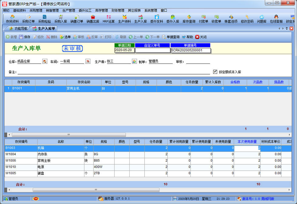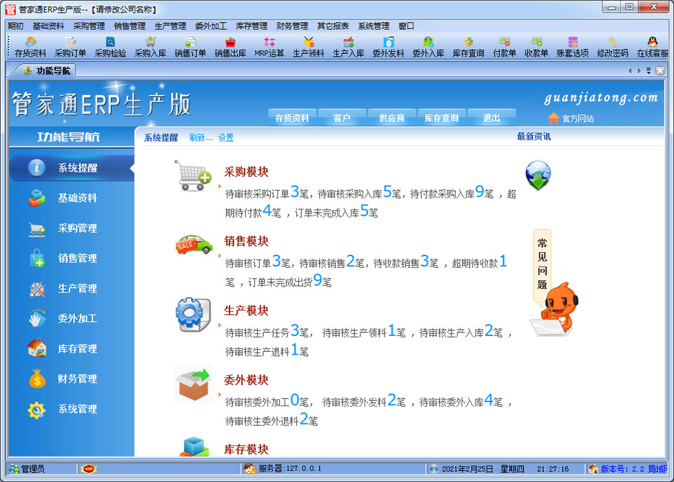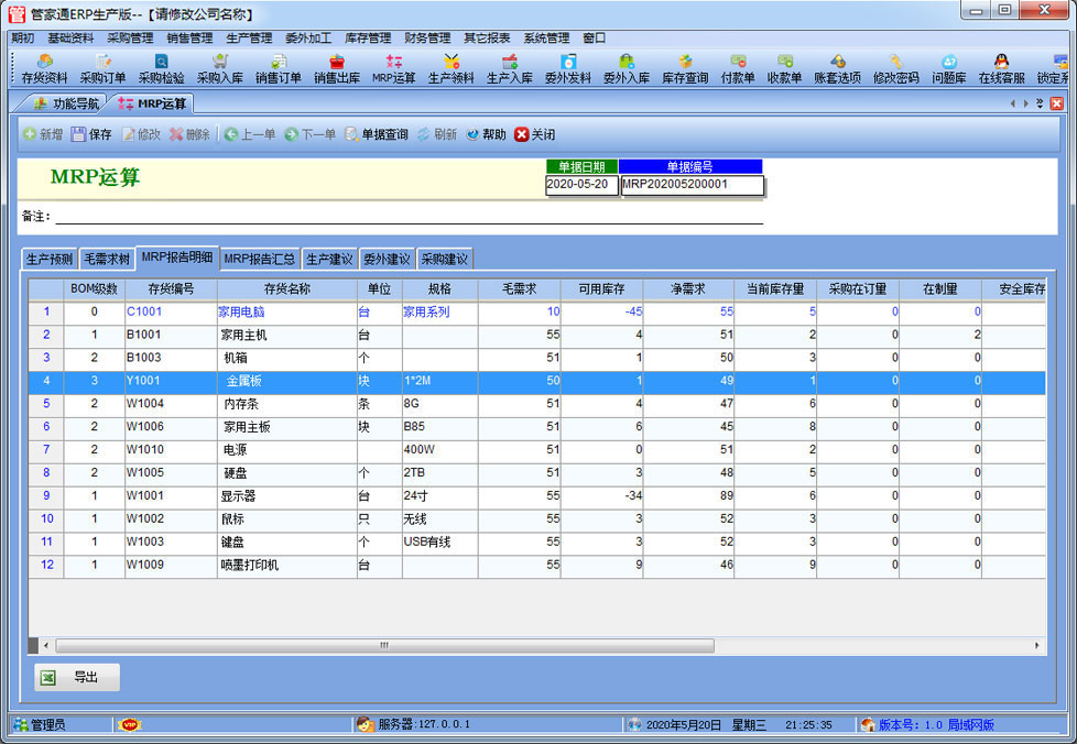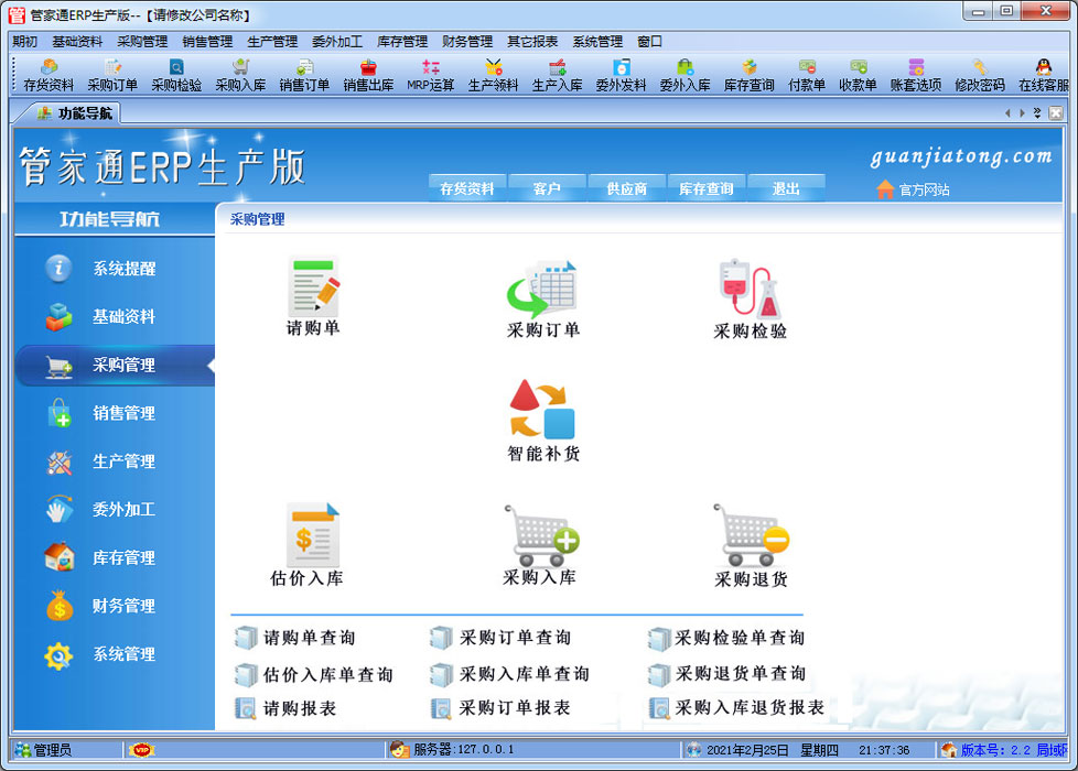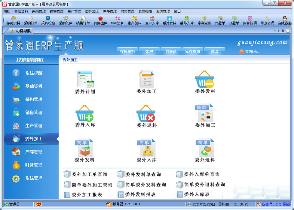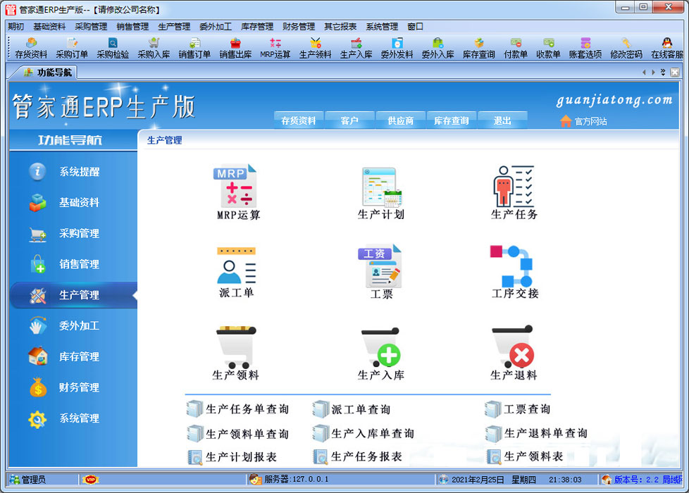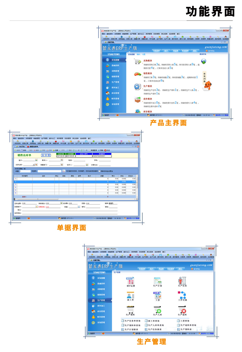 管家通ERP生產版是一款專業(yè)的生產企業(yè)管理系統(tǒng),其中包含采購系統(tǒng),自制生產系統(tǒng),委外加工管理系統(tǒng),庫存管理系統(tǒng)(倉庫管理系統(tǒng)),財務和報表系統(tǒng)等子模塊。軟件界面設計簡潔,美觀,其人性化的軟件流程,使普通用戶不需培訓也能很快掌握軟件操作使用方法,上手極易。 采購管理:進行存貨的采購訂單,采購檢驗,估價入庫,采購入庫,采購退貨等管理。 銷售管理:銷售報價,銷售訂單,銷售出庫,銷售退貨等管理。 生產管理:MRP運算,生產計劃,生產任務,派工,工序交接,生產領料,生產入庫等管理 委外加工:委外計劃,委外發(fā)料,委外入庫,委外退料等管理。 庫存管理:包括庫存之間調拔,庫存報損、報溢,庫存盤點功能。 財務管理:預付款、預收款,應收應付款,收入支出,發(fā)票管理。 權限管理:可添加刪除系統(tǒng)操作員帳號,強大的權限控制,可以設置某用戶對某窗口某個按鈕的權限。 打印設計:可對系統(tǒng)內每個單據(jù)進行打印的格式設計,可以導出,導入,每個操作員可設計自己的打印格式。 界面設計:系統(tǒng)窗口界面名稱可以自定義設計,表格的顯示順序,寬度,是否顯示等,每個操作員可以設計自己的界面。 資料授權:可對系統(tǒng)中倉庫,供應商,客戶,存貨資料進行分別授權給指定的操作員。 賬套設置:可根據(jù)需要對系統(tǒng)的參數(shù)進行配置,實現(xiàn)個性化的需求。 |