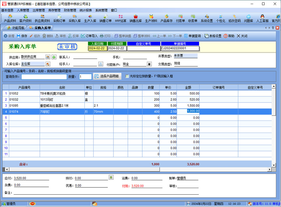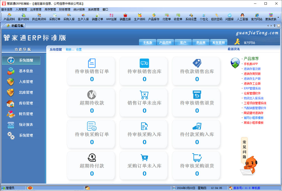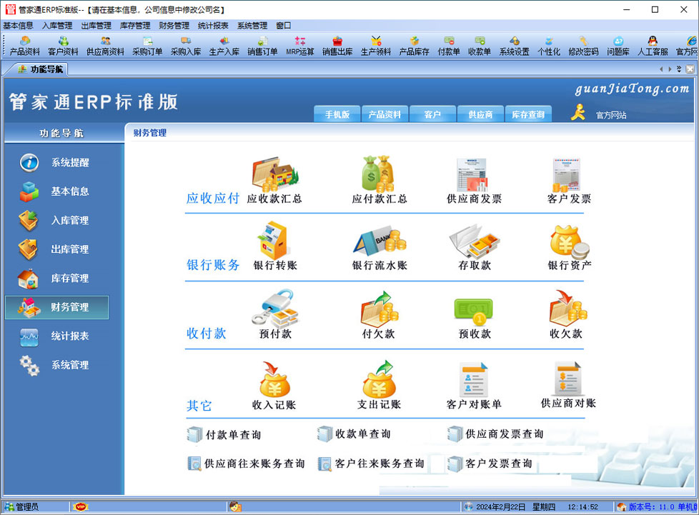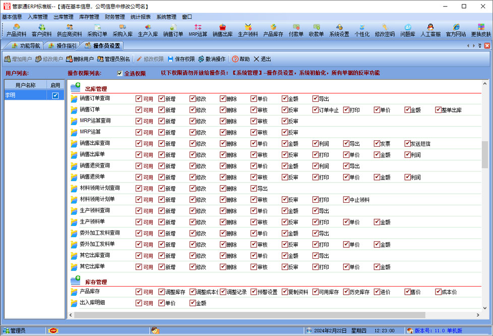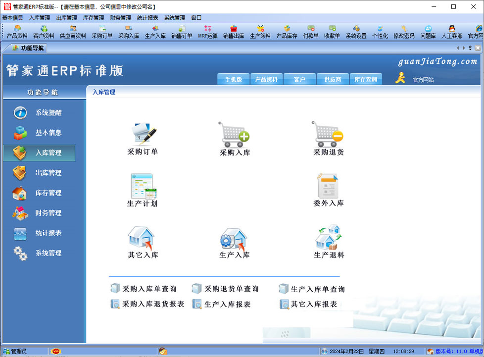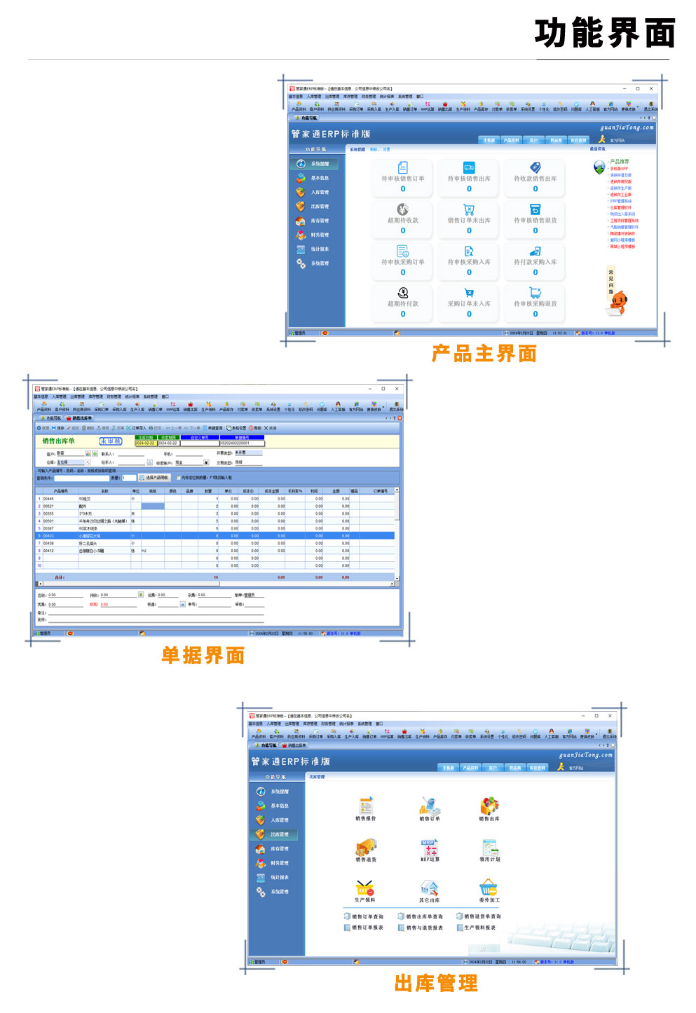 管家通ERP標(biāo)準(zhǔn)版是一款專業(yè)的生產(chǎn)制造企業(yè)的ERP管理軟件,可對成品的BOM設(shè)置,客戶訂單下達后根據(jù)BOM進行MRP物料需求運算。其中包含產(chǎn)品銷售管理系統(tǒng) ,庫存管理系統(tǒng)(倉庫管理系統(tǒng)),財務(wù)和報表系統(tǒng)等子模塊。軟件界面設(shè)計簡潔,美觀,其人性化的軟件流程,使普通用戶不需培訓(xùn)也能很快掌握軟件操作使用方法,上手極易。強大報表與集成查詢功能是本軟件的最大特色,所有功能在用戶需要的使用地方自然體現(xiàn),不用打開多個窗口重復(fù)查詢。易特進銷存軟件廣泛適用于企業(yè),商貿(mào)公司,個體門店等用于商業(yè)銷售管理, 庫存管理,財務(wù)管理等,客戶管理,員工管理等場合,是您企業(yè)進行信息化管理的強大工具。 入庫管理:進行產(chǎn)品采購入庫,采購?fù)素洠少徣霂欤饧庸と霂臁?/p> 出庫管理:銷售訂單,銷售出庫,客戶退貨,生產(chǎn)計劃,MRP物料需求運算,委外加工發(fā)料。 庫存管理:包括庫存之間貨品調(diào)拔,庫存報損、報溢,庫存盤點功能。 財務(wù)管理:預(yù)付款、預(yù)收款,應(yīng)收應(yīng)付款,收入支出,,供應(yīng)商往來帳務(wù),供應(yīng)商付款,客戶往來帳務(wù),客戶付款 。 統(tǒng)計報表:完整的統(tǒng)計查詢功能,每張單據(jù)每次業(yè)務(wù)金額都可以清楚的反映。 權(quán)限管理:可添加刪除系統(tǒng)操作員帳號,強大的權(quán)限控制,可以設(shè)置某用戶對某窗口某個按鈕的權(quán)限。 打印設(shè)計:可對系統(tǒng)內(nèi)每個單據(jù)進行打印的格式設(shè)計,可以導(dǎo)出,導(dǎo)入,每個操作員可設(shè)計自己的打印格式。 界面設(shè)計:系統(tǒng)窗口界面名稱可以自定義設(shè)計,表格的顯示順序,寬度,是否顯示等,每個操作員可以設(shè)計自己的界面。 系統(tǒng)設(shè)置:可以靈活設(shè)置系統(tǒng)小數(shù)位數(shù),可選0-6位,讓帳務(wù)更精確,可對以往數(shù)據(jù)進行選擇性的清除,以便系統(tǒng)初始化。 數(shù)據(jù)備份:可隨時對系統(tǒng)數(shù)據(jù)庫進行安全備份,以防數(shù)據(jù)丟失。 |
