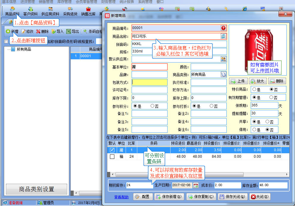 第2步:建立商品資料,建立好商品資料后可以供進貨,銷售出庫時調用,【基本信息】--【商品資料】打開如圖所示的窗口