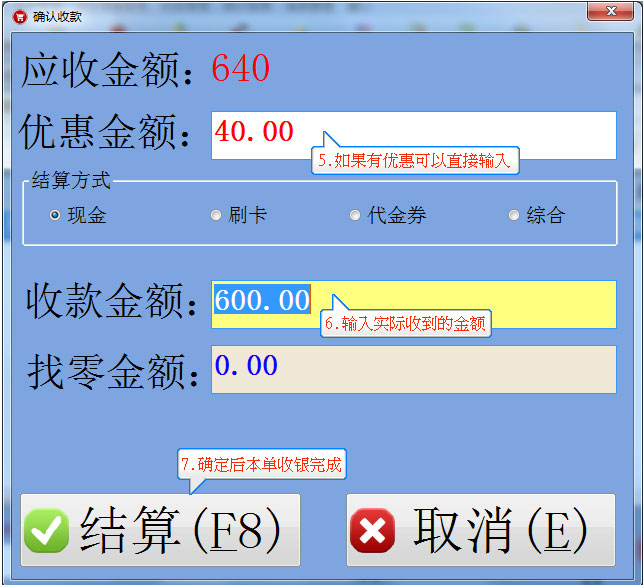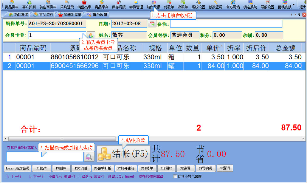 第9步:前臺收銀,對會員的零售可用前臺收銀,收銀和客戶的銷售出庫是完全兩個獨立的模塊,會員只能收現金不能用于欠款銷售,并不能修改已收銀過的單據,只能做廢,直接點擊工具欄上前臺收銀按鈕打開如圖所示的窗口