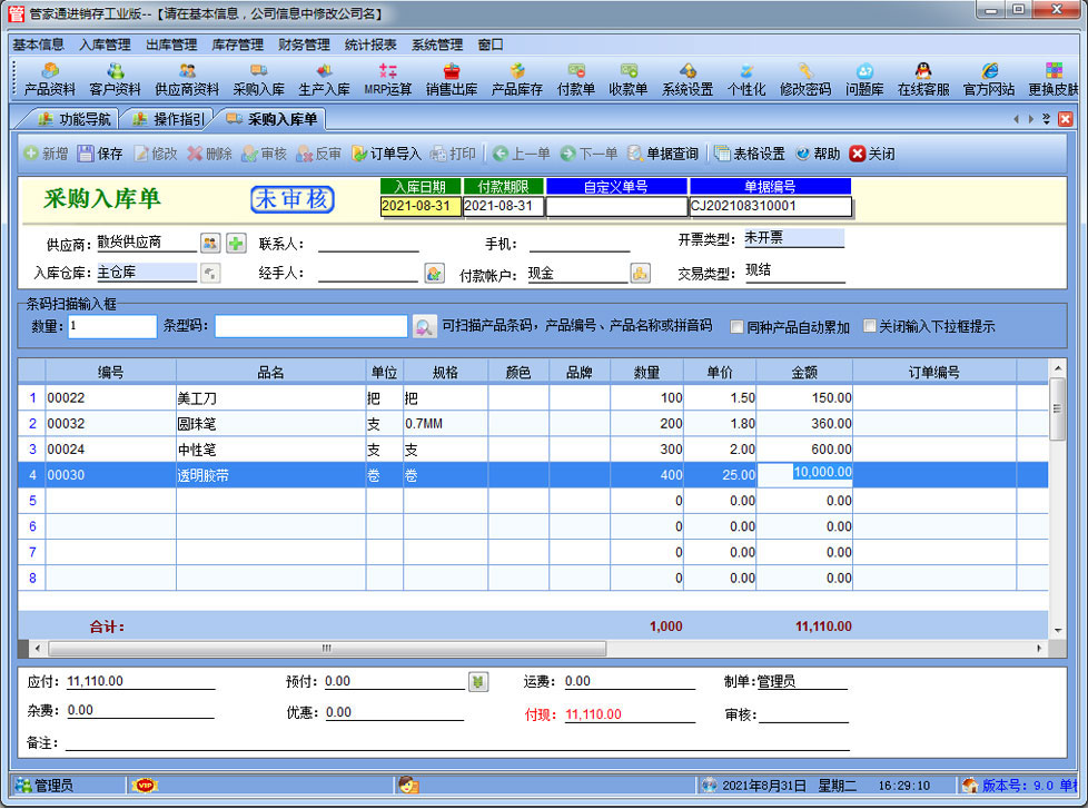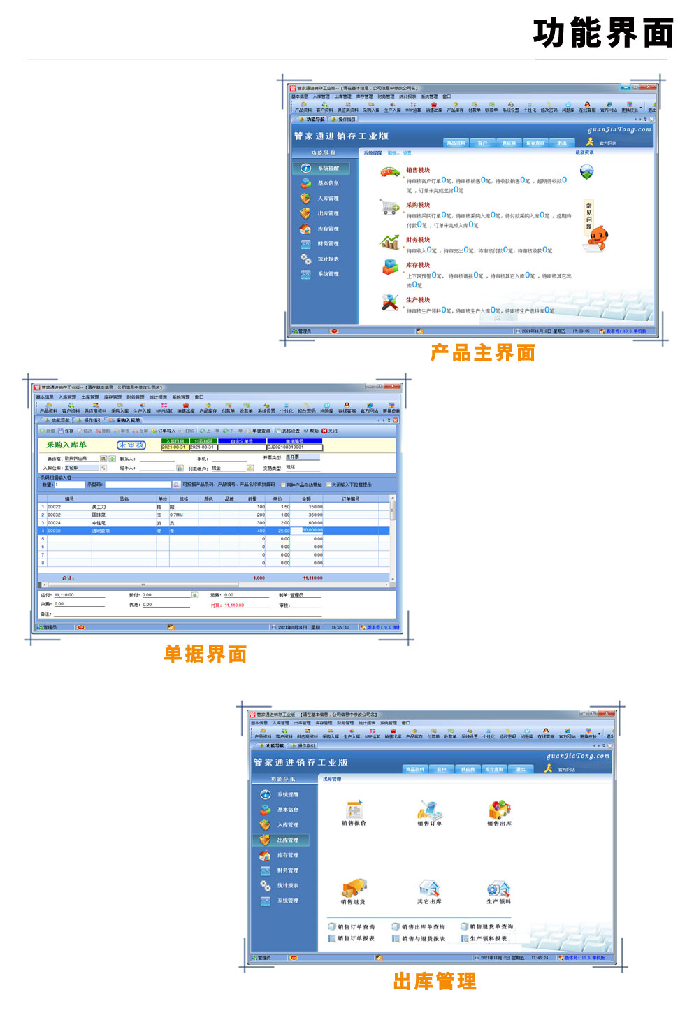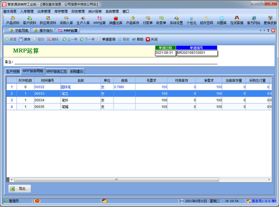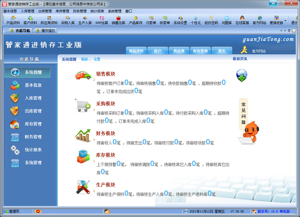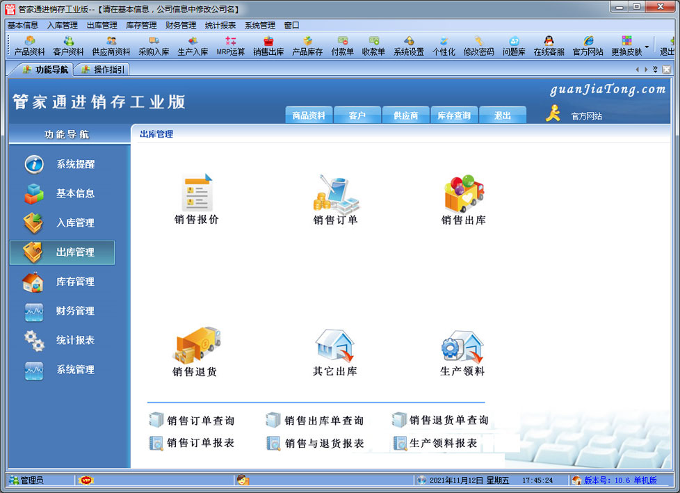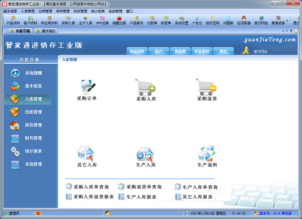 管家通進銷存工業版是一款專業的生產制造企業的進銷存管理軟件,可對成品的BOM設置,客戶訂單下達后根據BOM進行MRP物料需求運算。其中包含產品銷售管理系統 ,庫存管理系統(倉庫管理系統),財務和報表系統等子模塊。軟件界面設計簡潔,美觀,其人性化的軟件流程,使普通用戶不需培訓也能很快掌握軟件操作使用方法,上手極易。強大報表與集成查詢功能是本軟件的最大特色,所有功能在用戶需要的使用地方自然體現,不用打開多個窗口重復查詢。管家通進銷存軟件廣泛適用于企業,商貿公司,個體門店等用于商業銷售管理, 庫存管理,財務管理等,客戶管理,員工管理等場合,是您企業進行信息化管理的強大工具。 入庫管理:進行產品采購入庫,采購退貨,采購入庫,委外加工入庫。 出庫管理:銷售訂單,銷售出庫,客戶退貨,MRP物料需求運算,委外加工發料。 庫存管理:包括庫存之間貨品調拔,庫存報損、報溢,庫存盤點功能。 財務管理:預付款、預收款,應收應付款,收入支出,,供應商往來帳務,供應商付款,客戶往來帳務,客戶付款 。 統計報表:完整的統計查詢功能,每張單據每次業務金額都可以清楚的反映。 權限管理:可添加刪除系統操作員帳號,強大的權限控制,可以設置某用戶對某窗口某個按鈕的權限。 打印設計:可對系統內每個單據進行打印的格式設計,可以導出,導入,每個操作員可設計自己的打印格式。 界面設計:系統窗口界面名稱可以自定義設計,表格的顯示順序,寬度,是否顯示等,每個操作員可以設計自己的界面。 系統設置:可以靈活設置系統小數位數,可選0-6位,讓帳務更精確,可對以往數據進行選擇性的清除,以便系統初始化。 數據備份:可隨時對系統數據庫進行安全備份,以防數據丟失。 |