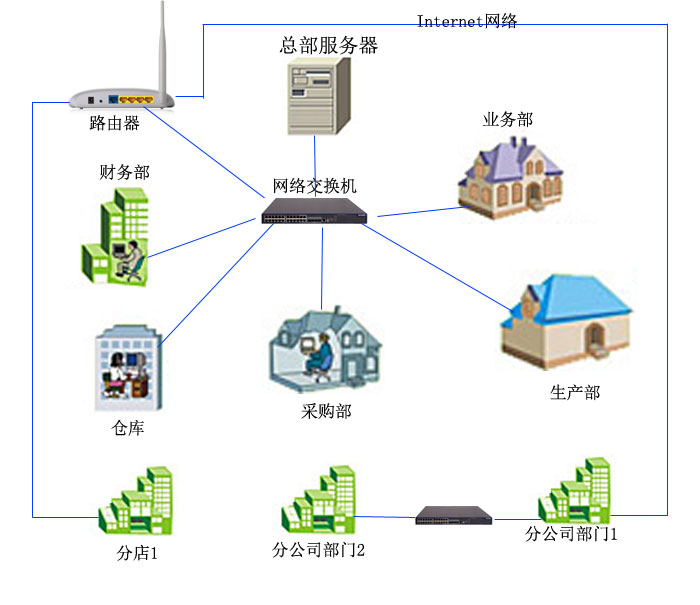 1、同在一個辦公室或一個庫房或一座大樓等多臺電腦同時辦公,又有門店,分公司等局域網+互聯網混合使用。