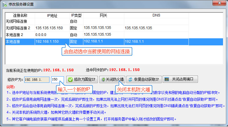方案一:用IP連接(推薦),修改IP地址為固定的IP,點擊“更改設置”按鈕打開始下圖,如電腦上有多個網卡,會自動選中當前使用的網絡連接,