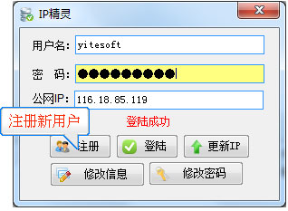 1、注冊IP精靈帳號,在服務器端上點擊“IP精靈”,打開如圖所示的窗口,點擊“注冊”按鈕后注冊一個帳號和密碼并登陸上