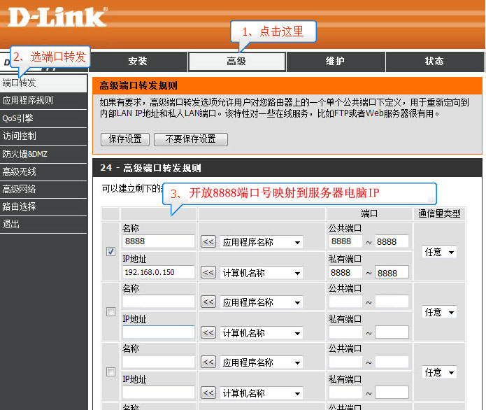 進去路由器后,點擊左側“轉發規則”---“虛擬服務器”,添加端口,如8888,IP地址為服務器端電腦的IP,如這里是192.168.1.150,協議TCP或是ALL,不能是UDP,后面要選用啟用,這樣當外部網絡請求該端口時自動將該請求轉到所設置IP的電腦上,需要注意的事項,安全設置里面有一個“高級安全設置”中的“忽略來自WAN口的Ping”一定不要選中,否則外部不能連接,該功能的意思是當外部請求時自動放棄。